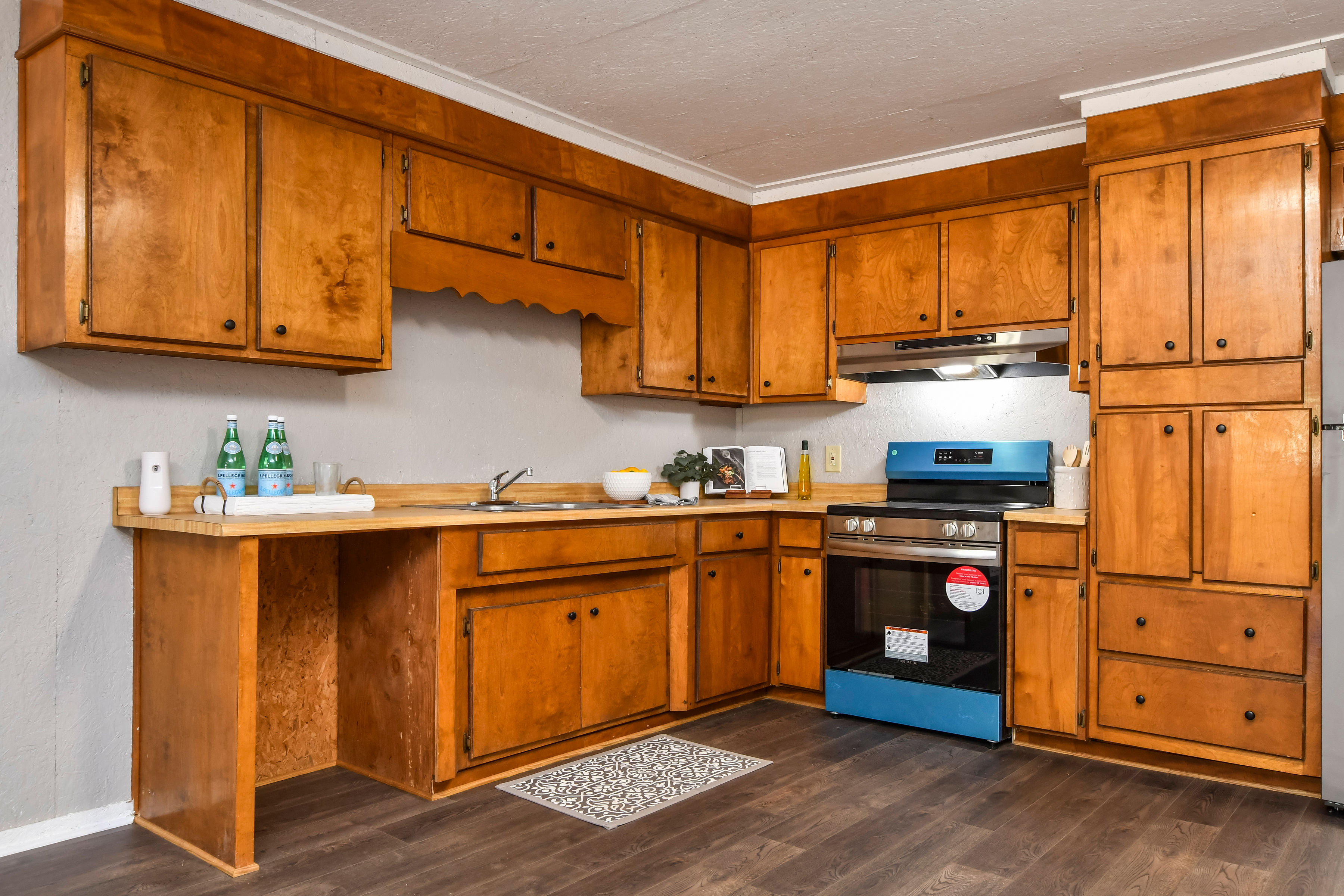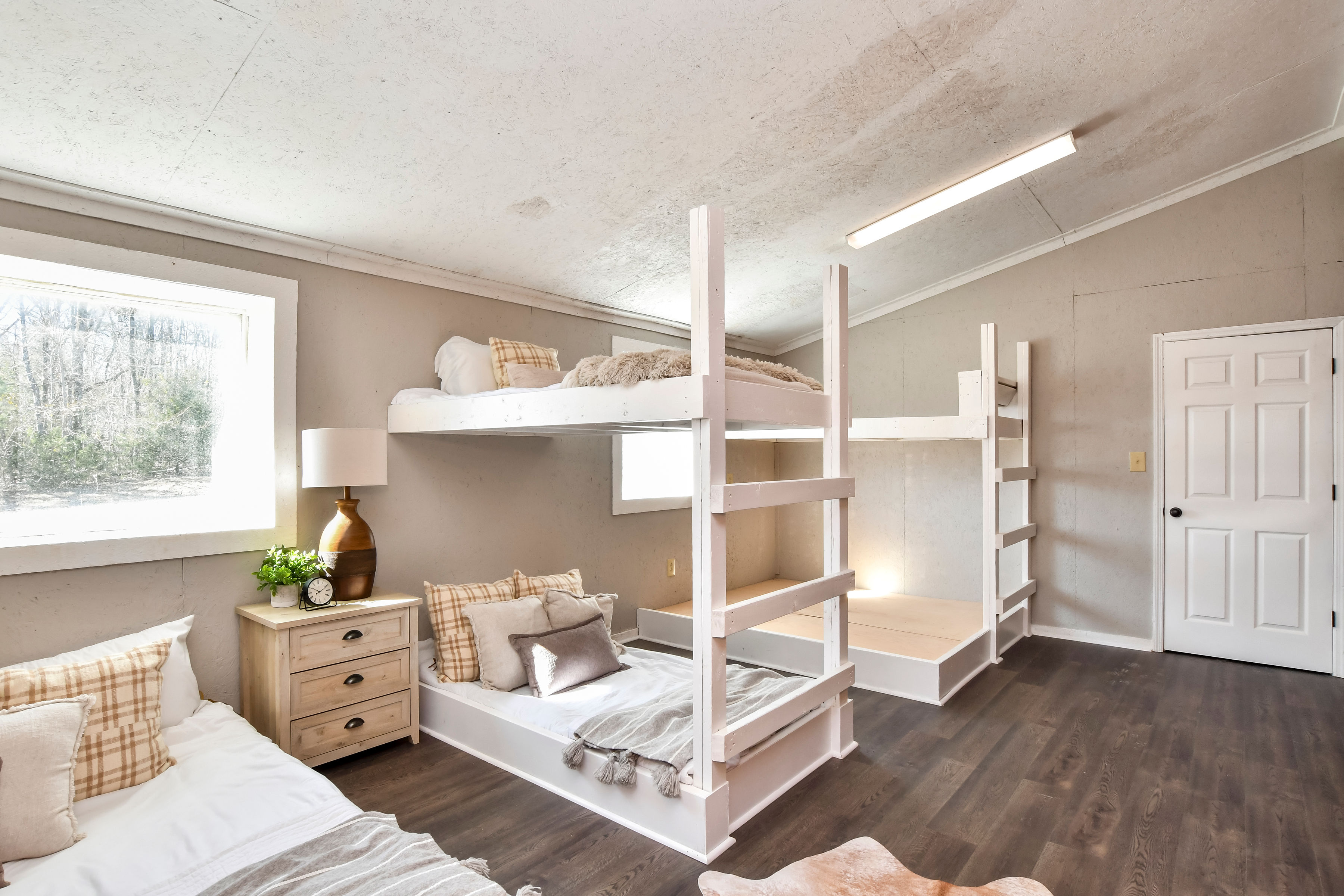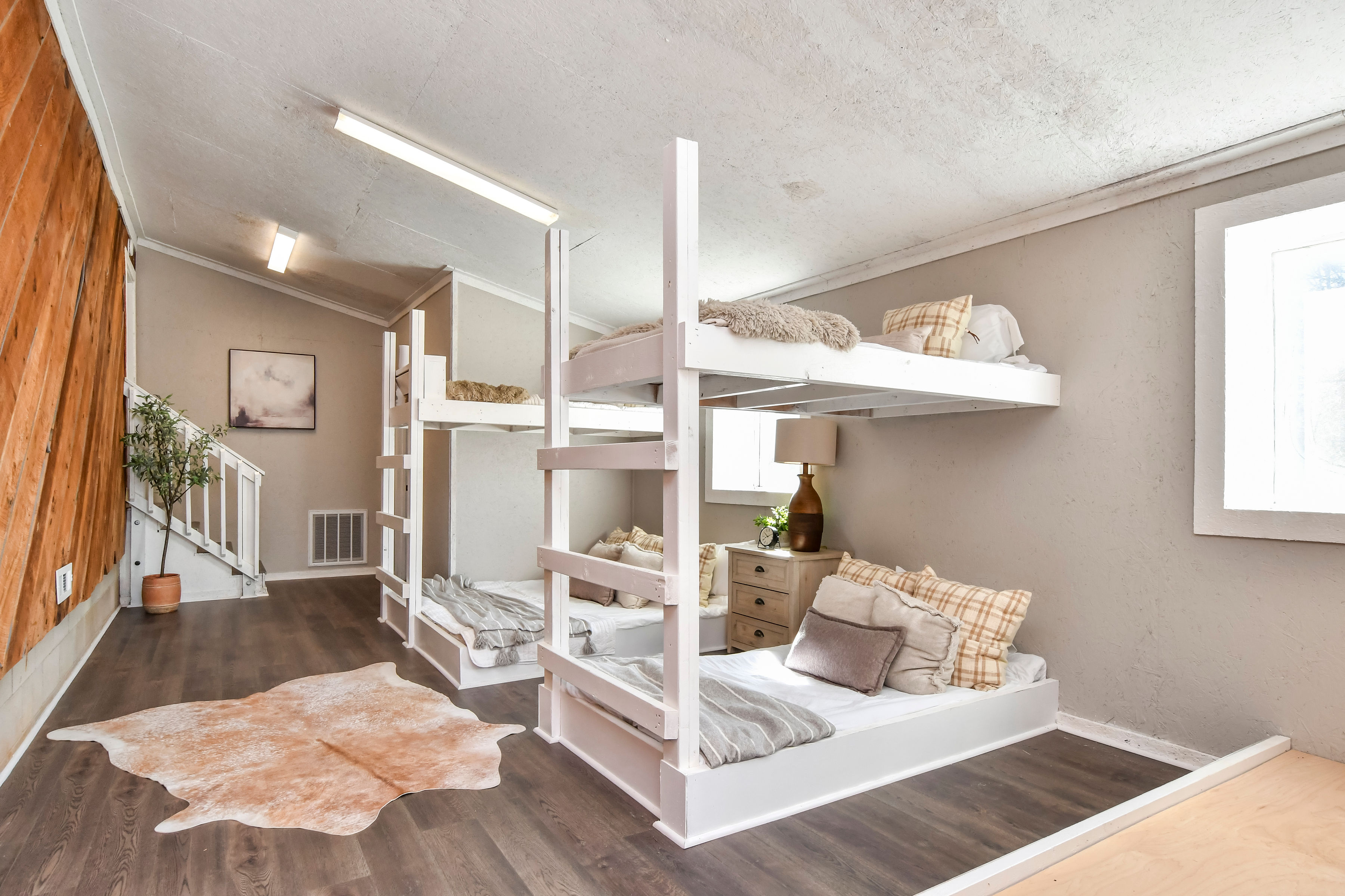 - Fully renovated ±4,200 sqft bunk house with living area, bedroom area, bathroom, full kitchen, and garage space with three large bay doors.